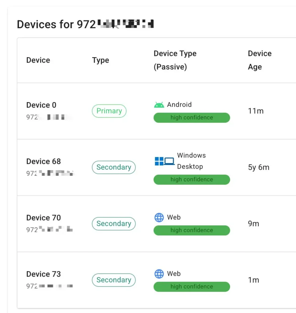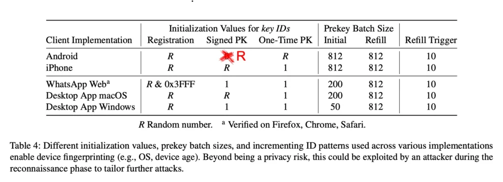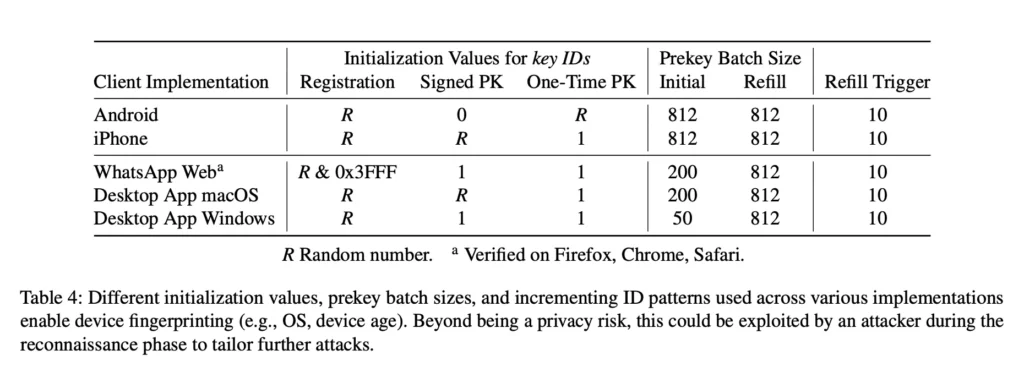 Pada tahun 2025, penelitian oleh Gegenhuber dan kolega menunjukkan bahwa perbedaan dalam sesi tidak hanya mengungkap identitas perangkat, tetapi juga memungkinkan fingerprinting perangkat lengkap, termasuk identifikasi pasti sistem operasi. Informasi ini dapat diperoleh hanya dengan meng-query server WhatsApp, tanpa interaksi langsung dengan perangkat korban dan tanpa sepengetahuan pengguna.