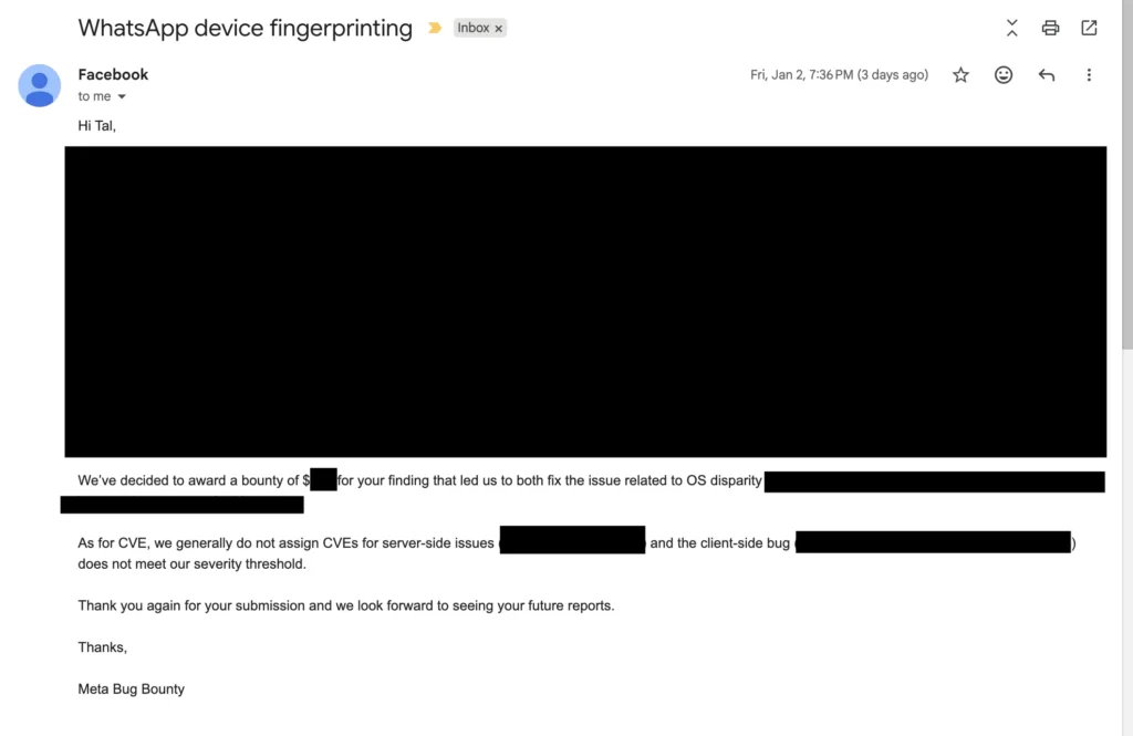 Dalam masalah fingerprinting perangkat serupa yang sebelumnya dilaporkan ke WhatsApp, perusahaan menerapkan perbaikan dan memberikan bug bounty kecil, tetapi tidak menetapkan CVE dengan alasan tidak “memenuhi ambang batas keparahan kami”.