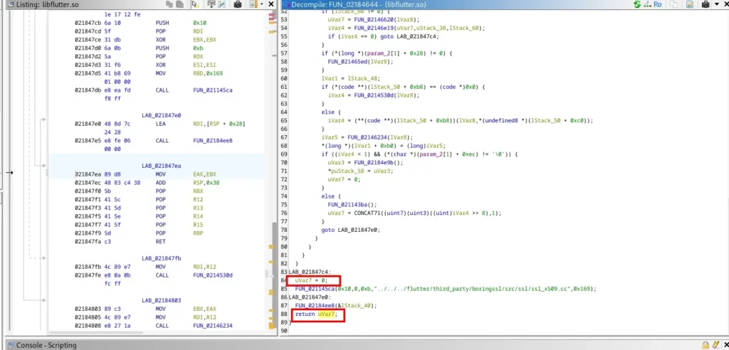 - Melakukan reverse engineering libflutter.so untuk menemukan fungsi verifikasi sertifikat