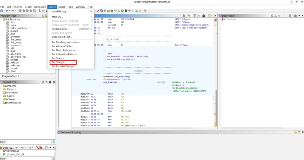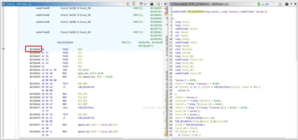 - Buka libflutter.so di Ghidra/IDA