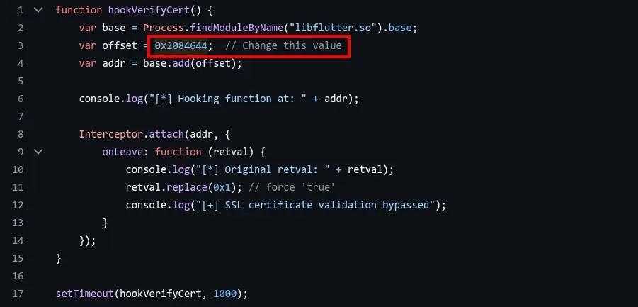 - Membuat script Frida yang spesifik berdasarkan offset yang ditemukan