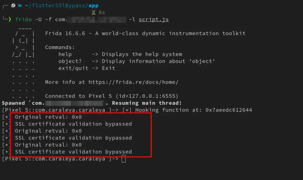 Kegagalan ini terjadi karena logika keamanan berada di dalam libflutter.so, library native yang tidak terekspos ke layer Java/Kotlin yang biasanya di-hook oleh Frida.