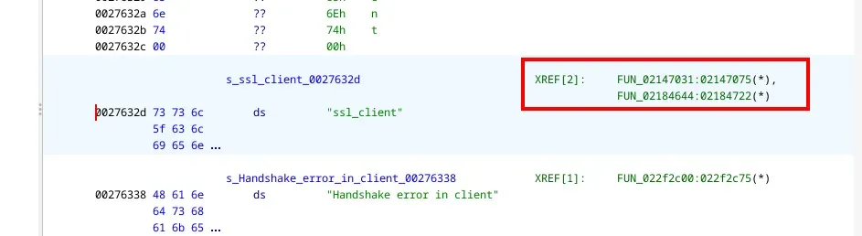 Cari ssl_client, lalu klik dua kali pada hasilnya dan jelajahi XREF-nya.
