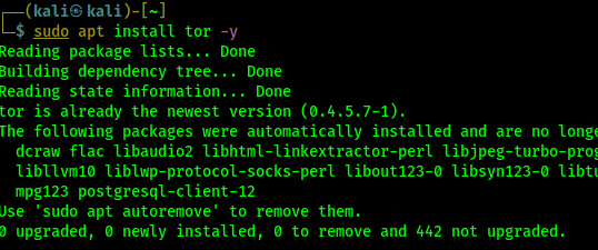 Pertama-tama kita menginstal dan mengonfigurasi layanan Tor di Kali Linux kita. Untuk melakukannya, kita jalankan perintah berikut di Terminal Kali Linux kita: