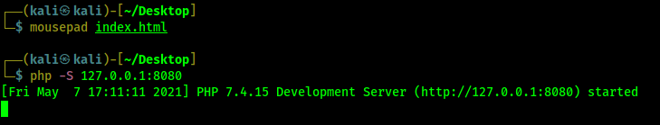 Sekarang kita buat halaman web di desktop kita yang disebut index.html atau index.php. Kita melakukannya dengan menggunakan perintah berikut: