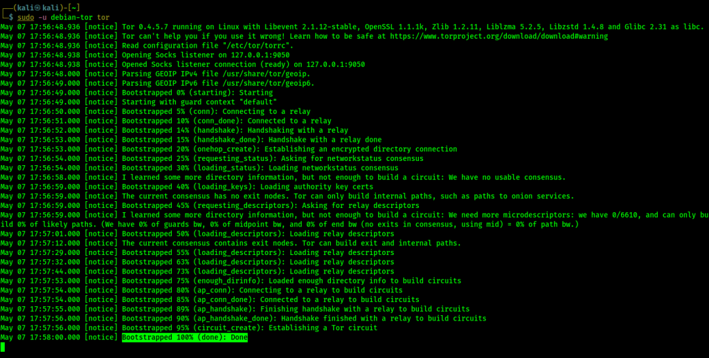 Tunggu sebentar dan biarkan konfigurasinya mencapai 100%. Ini akan membuat sirkuit Tor. Mungkin memerlukan waktu beberapa menit tergantung pada kinerja sistem dan kecepatan internet. Tangkapan layarnya adalah sebagai berikut: